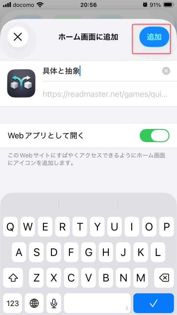 数秒後にホーム画面にアイコンが追加されます。次からは、このアイコンをタップするだけで、アドレスバーのないフルスクリーン(全画面モード)でクイズを楽しめます!