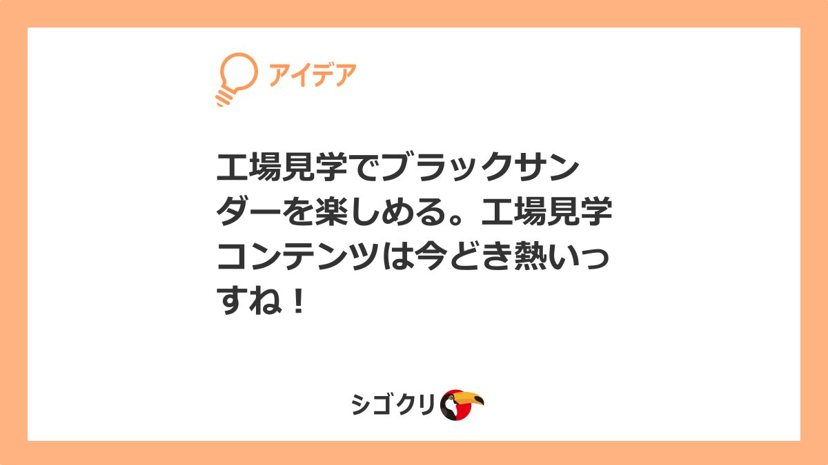 2025年6月18日 / 最終更新日時 : 2025年6月18日 シゴトクリエイター koujyoukengaku-black-thunder-atui FacebookXBlueskyCopy 違和感で発想のやり方が学べます日常生活で感じる違和感を用いて、アイデアを出すやり方が学べます。「違和感発想法」は誰でも気軽に出来るサービスです。 詳細はこちらFacebookXBlueskyCopy