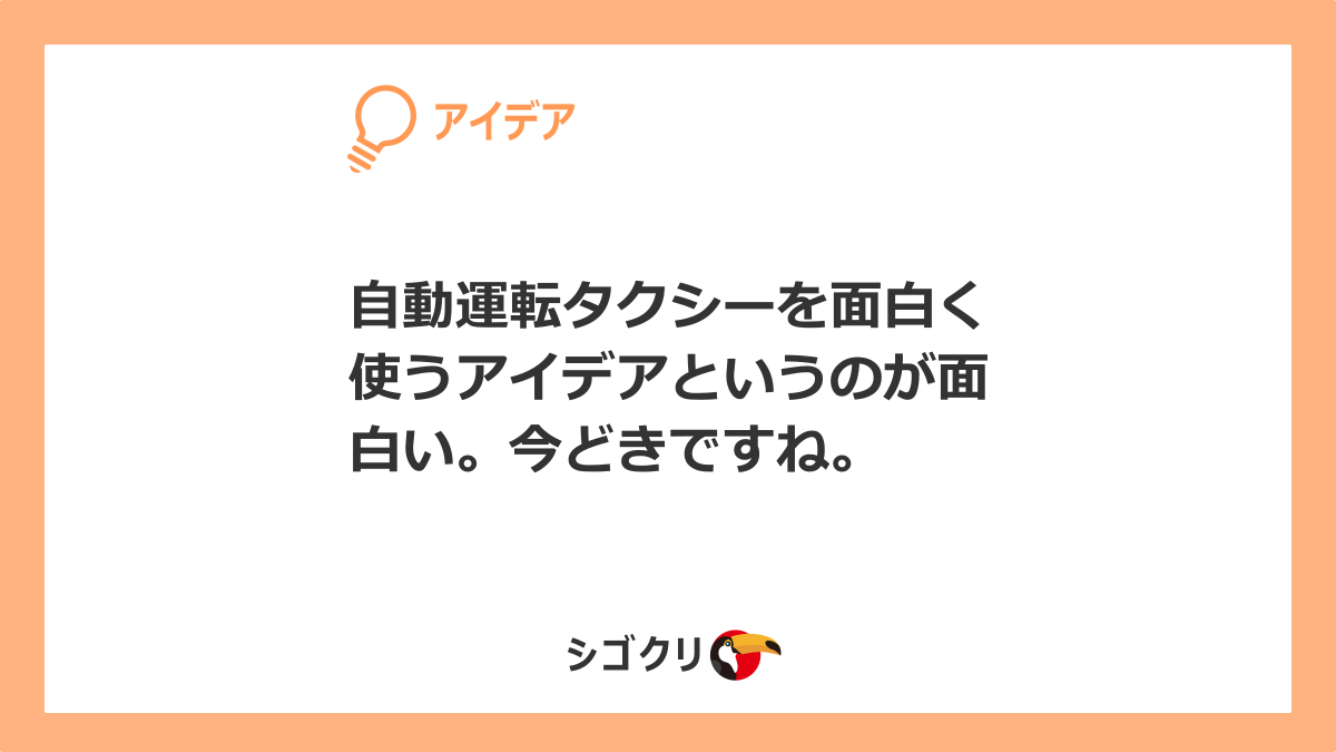 2025年6月16日 / 最終更新日時 : 2025年6月16日 シゴトクリエイター jidouunten-taxi-idea FacebookXBlueskyCopy ビジネスアイデア相談窓口ビジネスアイデアに関する、アイデアや企画、事業、起業についてカジュアルなご相談はお気軽に壁打ち可能です。 詳細はアイデア相談窓口(お仕事依頼)をご参照ください。 大橋に相談してみるFacebookXBlueskyCopy