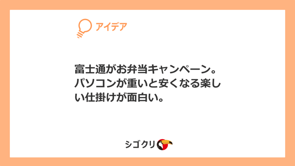富士通がお弁当キャンペーン。パソコンが重いと安くなる楽しい仕掛けが面白い。