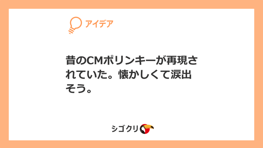 昔のCMポリンキーが再現されていた。懐かしくて涙出そう。