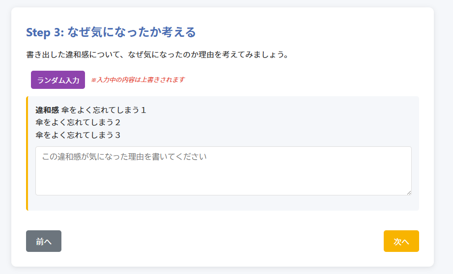 • 複数行の入力に対応しました。違和感、理由の2つに対して。テーマ、キーワードは対応していません。