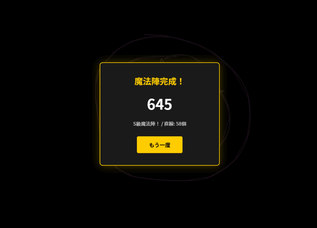 ドロー系ゲームです。魔法陣っぽいものを描くと高得点。直線ベースで汚いですが、ゆっくりなぞってみてください。
