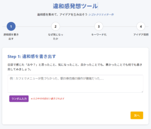 2025年12月19日 / 最終更新日時 : 2025年12月19日 シゴトクリエイター image FacebookXBlueskyCopy 違和感で発想のやり方が学べます日常生活で感じる違和感を用いて、アイデアを出すやり方が学べます。「違和感発想法」は誰でも気軽に出来るサービスです。 詳細はこちらFacebookXBlueskyCopy