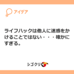 2026年1月13日 / 最終更新日時 : 2026年1月13日 シゴトクリエイター アイデアネタ ライフハックは他人に迷惑をかけてやることではない・・・っす。確かにすぎる。 他人に迷惑かけて楽する事をライフハックとは呼ばない「自分のケツは自分で拭くべき」「フリーライダーって奴ですね」 今回は概念ネタです(笑) ライフハックは自己完結するもの 自分のためにルーチンで白湯を起きたら飲むとか、そう […]