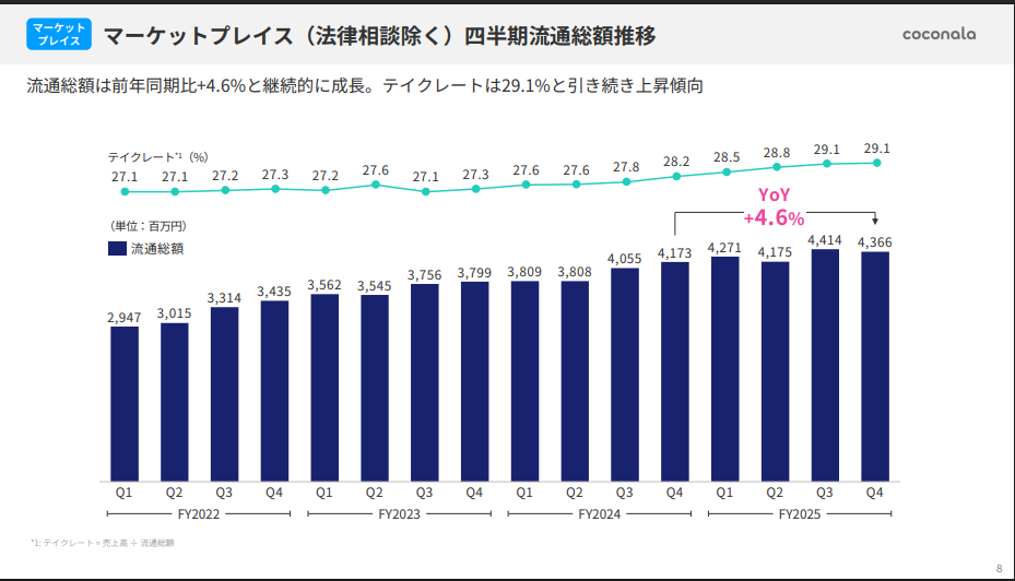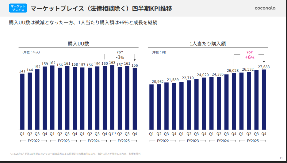 少なくとも、ココナラのマーケットプレイス事業が成長しているぞと思いたい人がいてもいいのですが、成長はかなり限定的で、僕は頭打ち感がある。成長自体はしているけども、それは購入者が増えているのでなく、むしろ固定の人がより買っている。それこそ法人になると、増えますしね。一方でそれが割に合うと出品者側が思っているかまではでてこないですからどうなんだと。エコシステムとして持続できるか?きついとか厳しいならそこから離脱します。