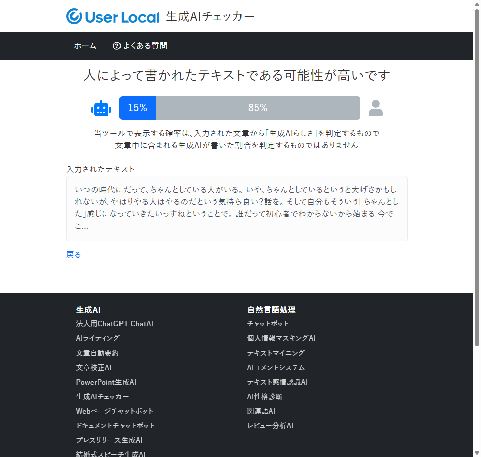 15%もAIらしいのかというツッコミもできるし、85%は人らしいからいいよねと。判断できるものが