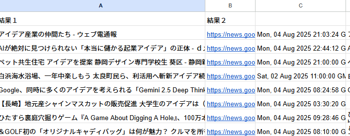 ただこれって、サジェストで飽きない感じでしたかっただけで、深い意味はないんですね。ただ検索で「アイデア」だけでは面白くないかなってところでした。Googleニュースを「アイデア」と他ワードで検索しているだけといえばそれだけです。それを毎日トリガーで動かしていたってことですね。使わないので切りました!
