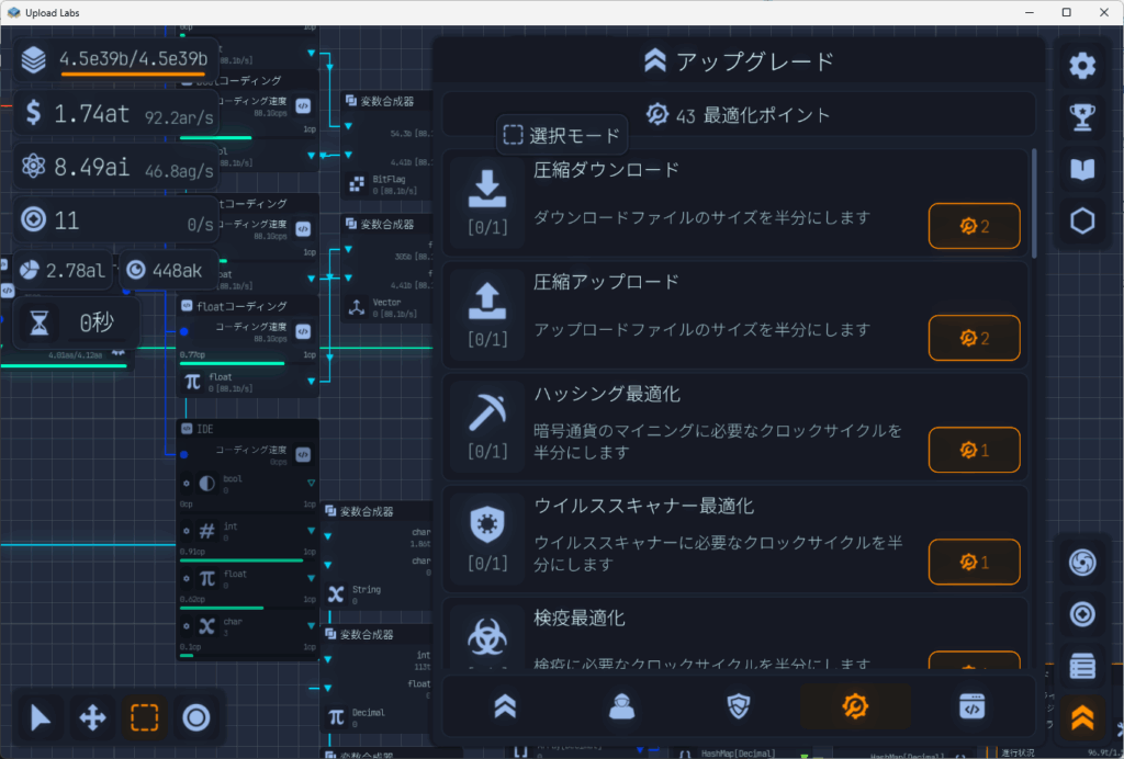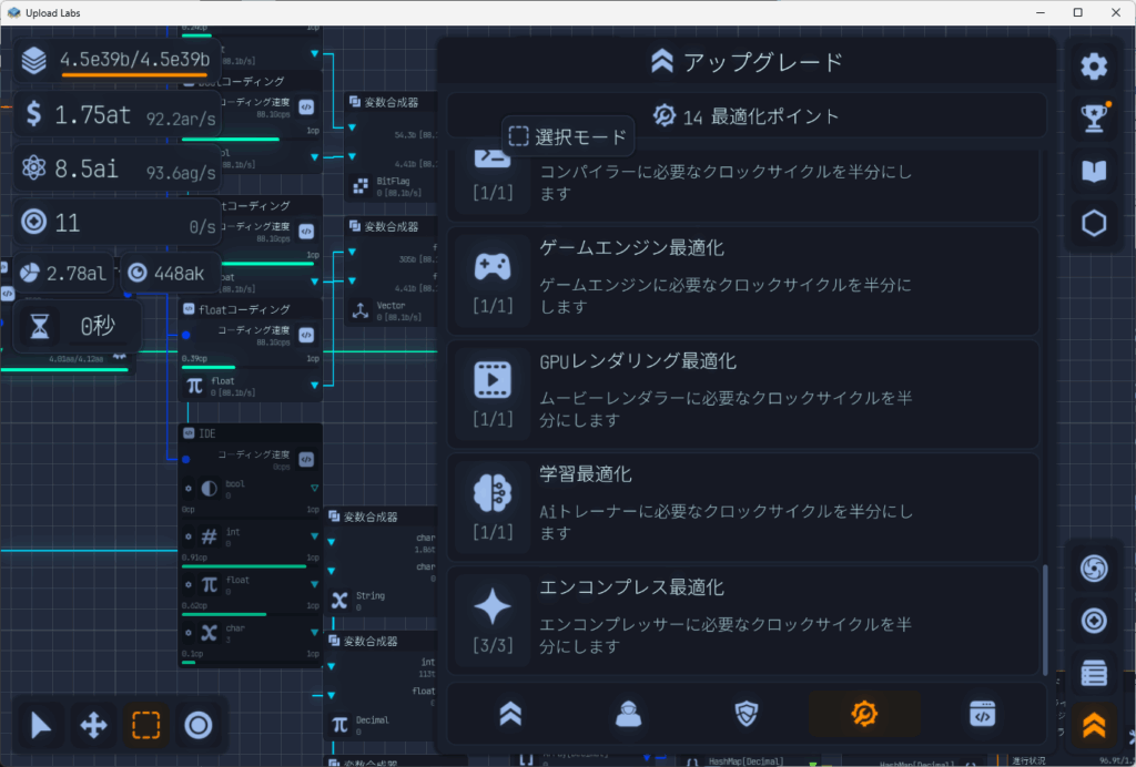 最適化のアップグレードはかなりの種類がある。全て1回でなく、いくつかは複数回ポイントを適用しないと「いけない」のでなく、1回で充分ということだ。あとゲームのレビューにもそんな指摘はあった・・・。なんてこった。